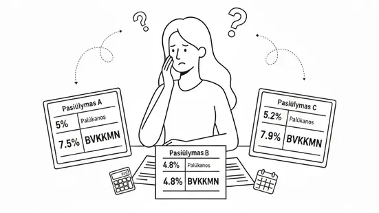 - Lyginkite tiesiogiai: rinkdamiesi tarp kelių panašios sumos ir trukmės paskolų, pirmenybę teikite tai, kurios BVKKMN yra mažesnė.
